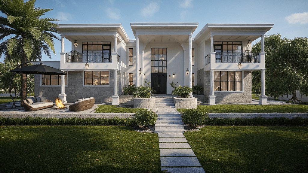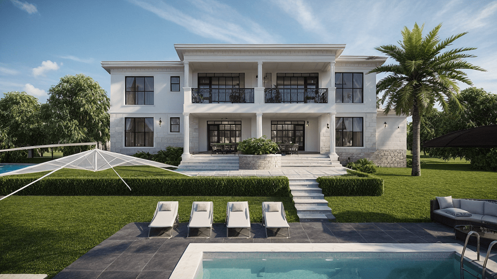 The home has been planned as a neoclassical retirement home with a grand design and symmetrical layout. The back porch opens out to a private pool sited on the south-western side of the compound, enjoying the warm afternoon sun.
