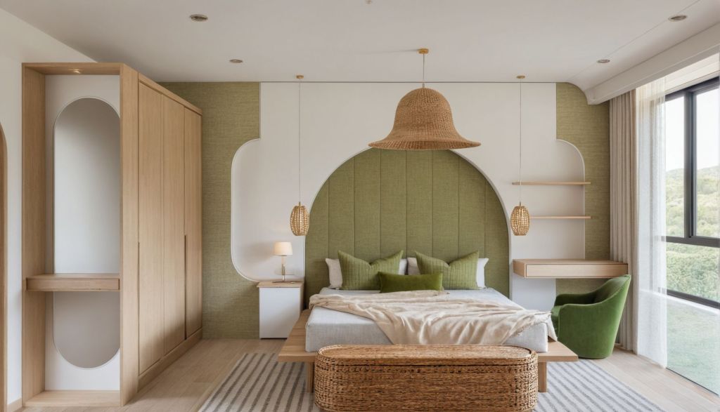 The furniture combines clean contemporary lines with plush comfort. Modular sofas, upholstered beds, and woven dining chairs are chosen to balance versatility with style. Rounded tables and curved seating silhouettes mirror the architectural forms, ensuring continuity between design elements.