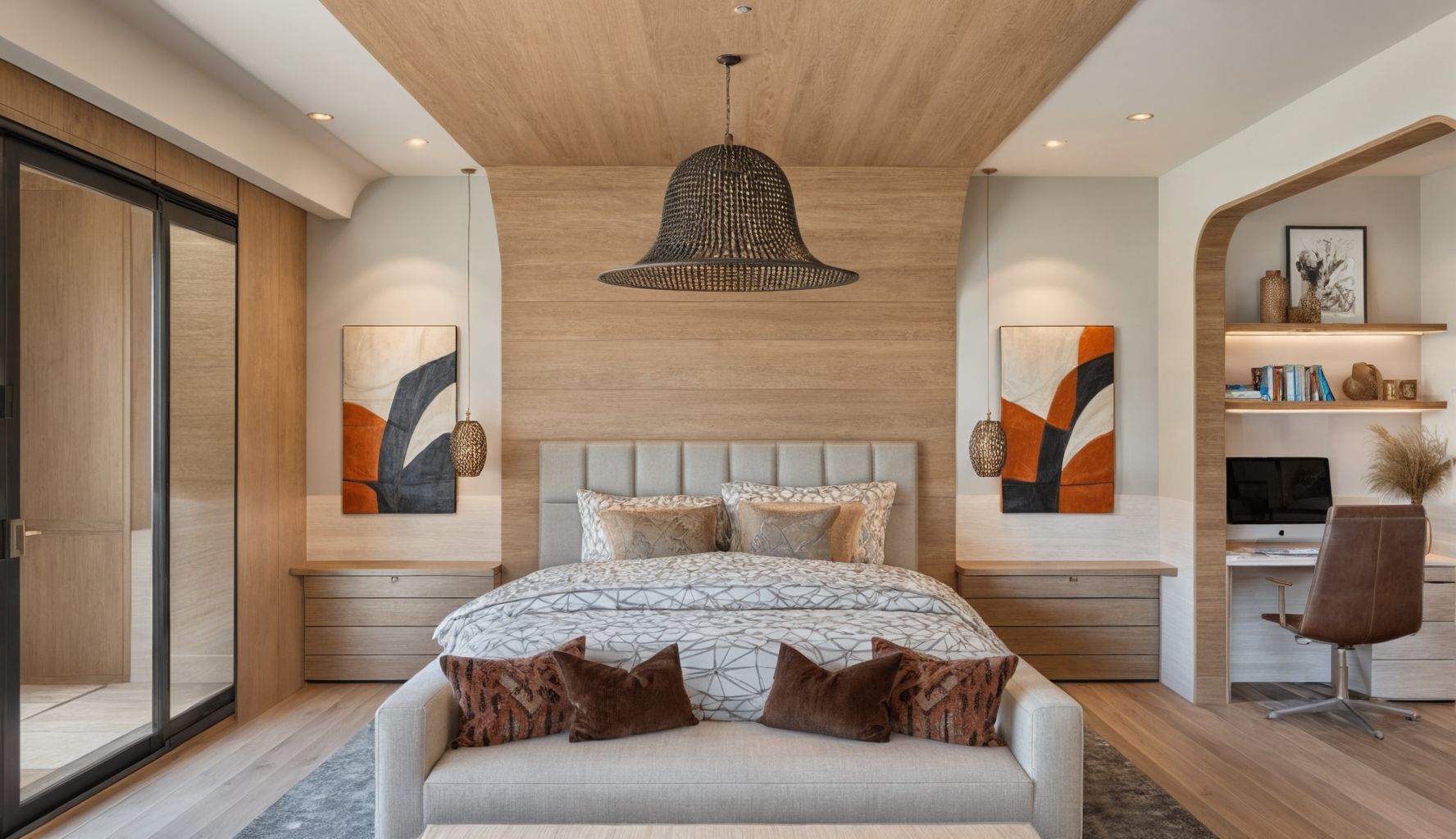 Natural textures are layered throughout to add depth and richness. Warm wood ceilings and paneling, tactile rattan and wicker details, soft textiles, and smooth stone-inspired finishes combine to create a tactile, grounded environment. These varied materials work together to achieve a calm yet dynamic aesthetic.